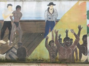 Muurschildering in Bluefields, Nicaragua. Kapitein Blaauvelt ontscheept zijn menselijke handelswaar.